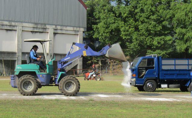 刈った草などを集めてトラックに積み込みます。これまでにためていた草木をショベルでを使ってトラックに積み込みます。