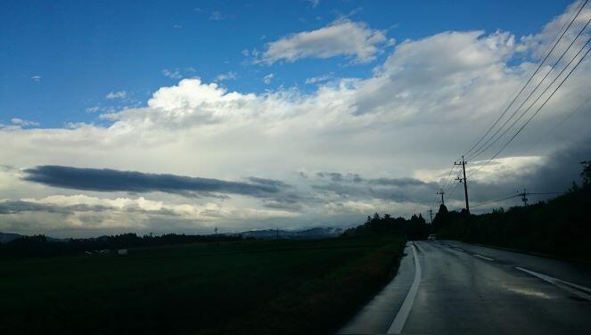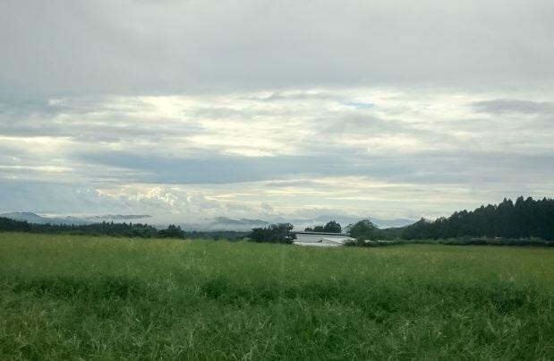 須木、野尻方面です。青空も見えますが、入道雲があります。また、空からカーテンのようなものもおりています。