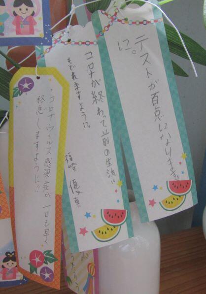 小さい七夕飾りが玄関のところに飾ってありました。願い事はコロナが早く終わるように、100点がとれますように、などでした。かなうことを祈ります。