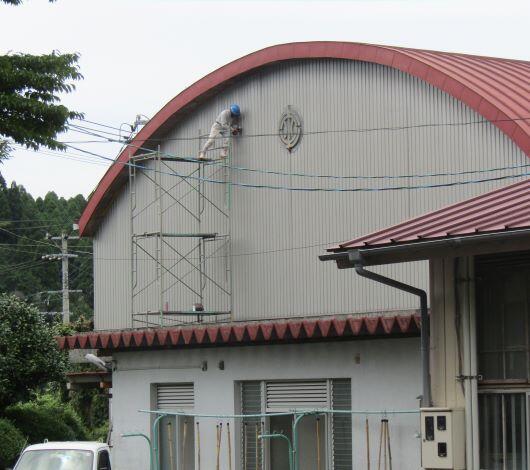 先週の大雨、強風の影響で、体育館の壁の一部がめくれてしまいました。雨がやまないと修理ができません。先週の水曜日、雨もやんだので、業者の方に修理をしてもらいました。午前、午後の3時間ほどで終わりました。ありがとうございました。そのまま修理ができないと、もっと大きくめくれたり、はがれて飛んでしまい、事故に繋がったりする心配がありました。ちょうど雨がやんでくれてほんとうに良かったです。安心しました。他にも、こつこつとしていただいています。ありがとうございます。