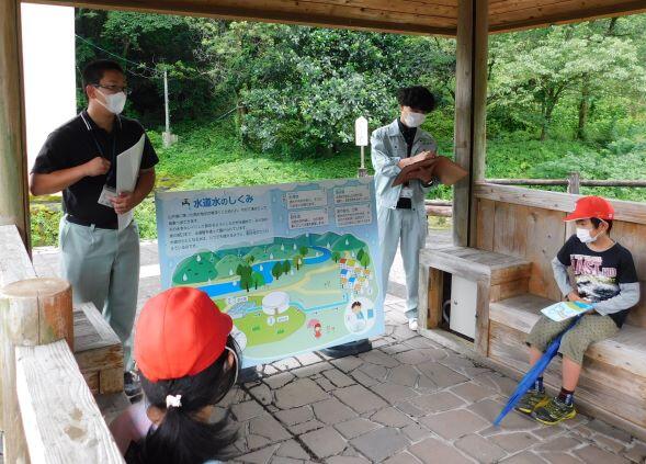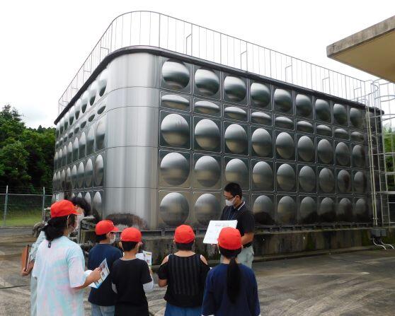 係の方から説明を聞きます。水道の水はどうやって届くのでしょうか?説明を聞いて分かったかな? 右側の塔ののようなものは・・・?水が出てきました(^^;)
