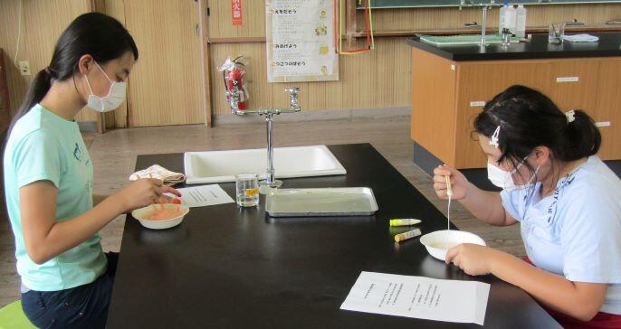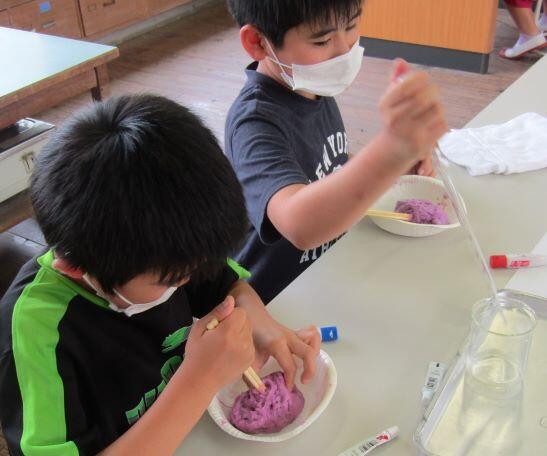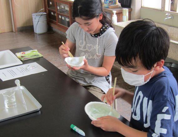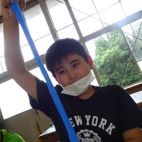 7月17日(金) この日はクラブ活動がありました。前回は木工制作で、ランプを作りましたが、今回はスライムを作りました。材料を入れて、混ぜます。絵の具を入れて、混ぜます。ぐるぐるぐるぐる(◎◎)これでもかと混ぜます。そして、得体の知れない液体を入れて混ぜると・・・。あ~ら不思議、だんだんと固まっていきます。最後は手にとってもんでいくと・・・スライムの完成です。不思議だね~(^^) 子どもたちはなぜなんだろう?って考えながら楽しくスライムを作っていました。
