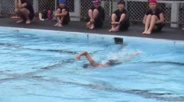 発表は1・2年生から小プールで行いました。輪っかをくぐり抜けて、底にある貝を拾います。上級生が応援していました(^^)/
