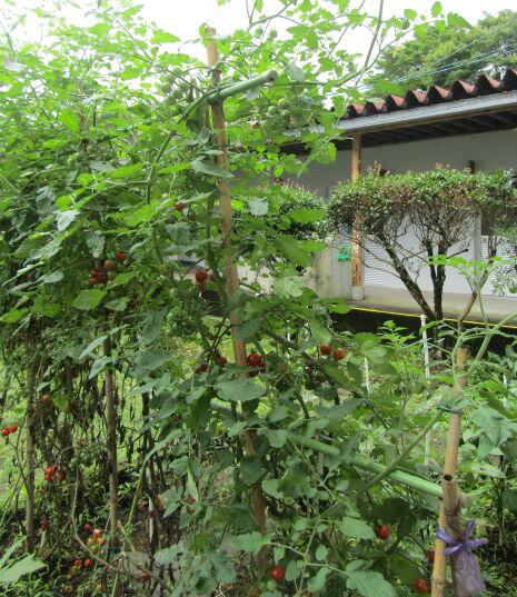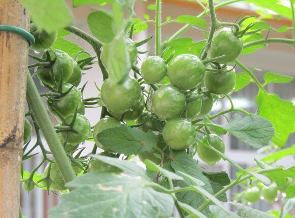 まだまだ青いのもあります。収穫はいつ? 隣にはピーマンもなっていましたよ(^^)/