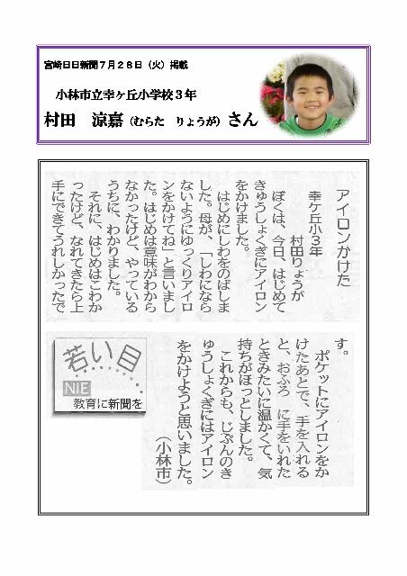 7月28日(火) この日の宮崎日日新聞の「若い目」の欄に本校の児童の作文が掲載されました。今年度第5号です。