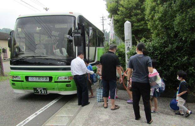 市営プールへ出発します。玄関先で教頭先生と事務の先生が見送ってくださいました。さあ、バスに乗り込みますよ!