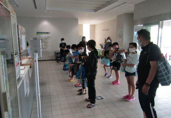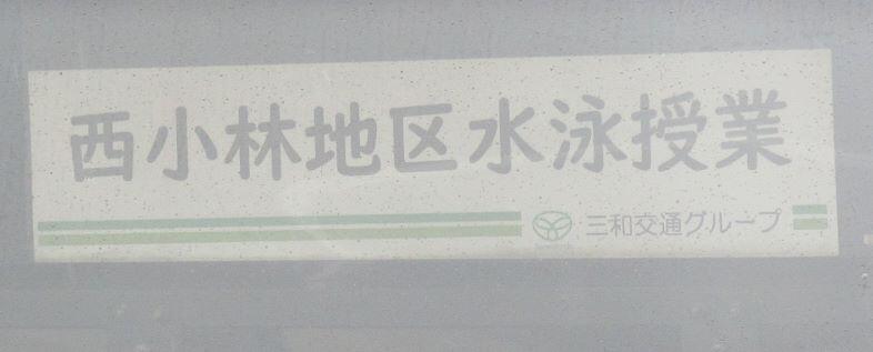 乗る前に消毒もしました!バスの窓には水泳授業の札が出ていました。市営プールに着きました。玄関脇で準備運動をして、