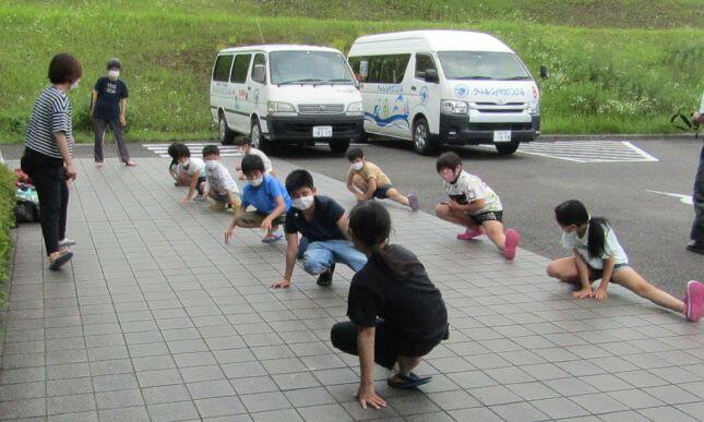 途中で水をかけたりするなど、邪魔が入ります!子どもたちは“きゃーきゃー”、“わーわー”言いながら進みます。輪っか