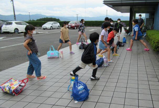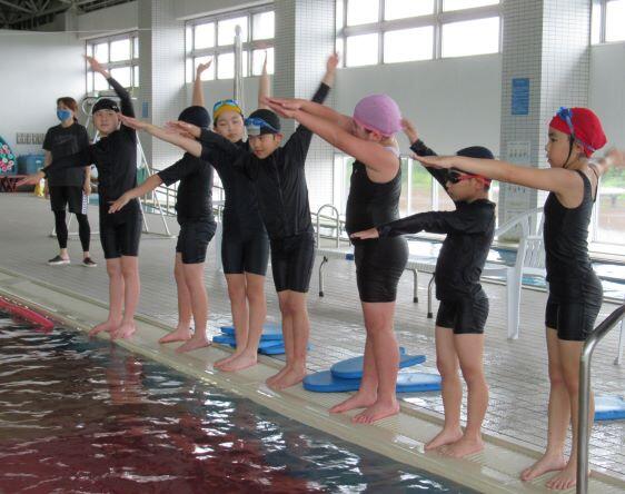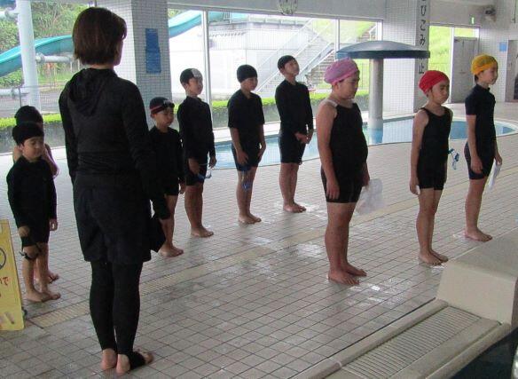水泳学習の様子です。到着後、準備運動です。この回から委員会の児童が前に出てやりました。この日はインストラクターの