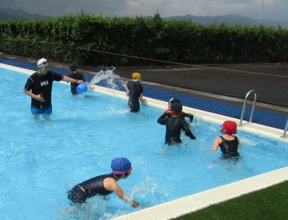 足でバシャバシャ、隣の人にバシャバシャ・・・。プールに入って歩きます。大きな水の流れができました!