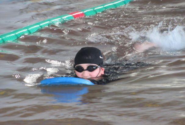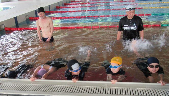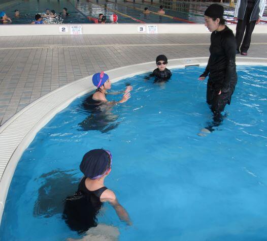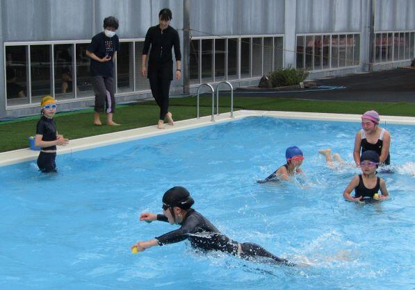 まねをしたり、顔をつけて歩く練習をしていました。その後、3~4年生は今の実力を確認するために、泳いでみました。