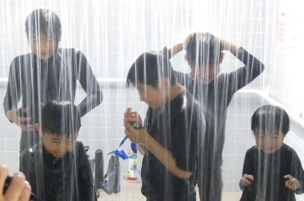 くぐりもしますよ。輪っかを持っている先生に水がかかろうがお構いなしです!(^o^) その後は貝拾いを2チームに