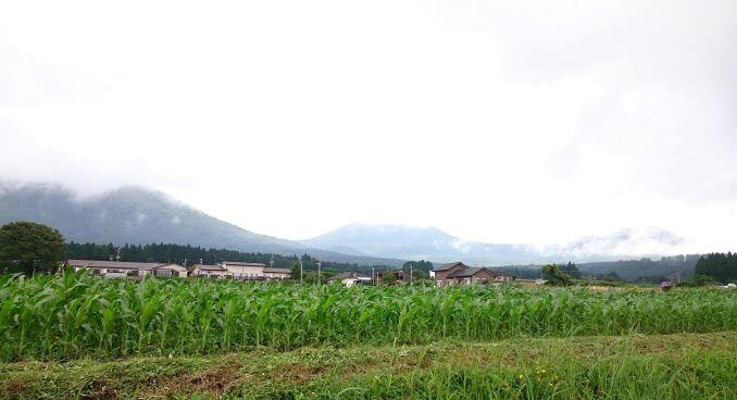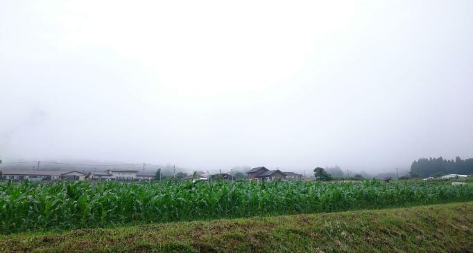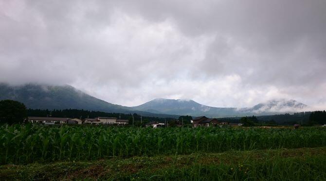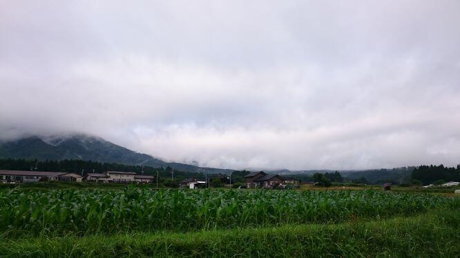 この日の朝の幸ヶ丘三岳です。雲霧・・・仁左衛門(失礼しました(^_^;)) 雲や霧に覆われていてなかなか全体を見せてくれません。手前のトウモロコシはずいぶんと大きくなりましたね。この日の夕方くらいからまた雨の予報です・・・。