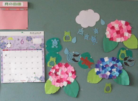 まずは図書館から・・・。6月の掲示に変わりました。紫陽花がとても可愛いですね。(^^) 隣は3・4年生の背面掲示です。