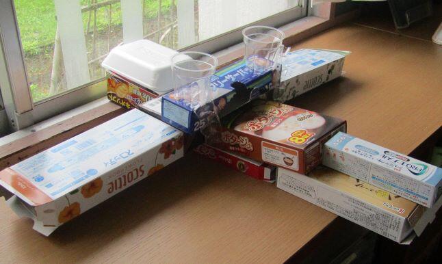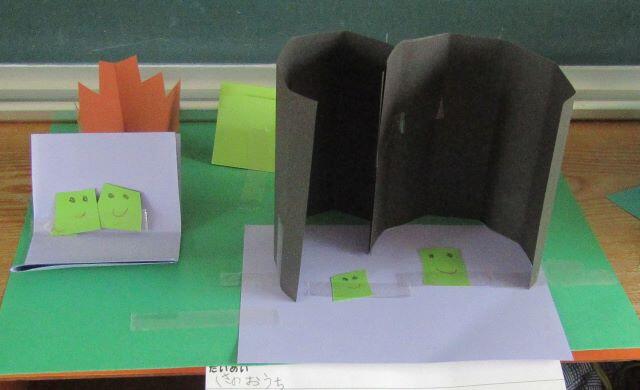 上の2枚は図工の作品です。色画用紙で「草のお家」を作りました。右は空き箱をつかっています。ロボットかな?(^o^)