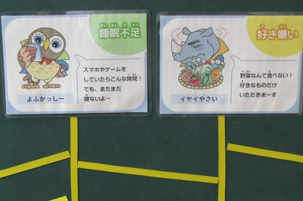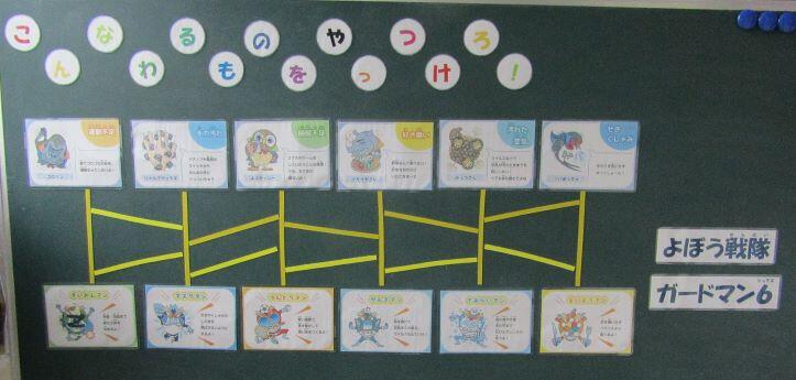 下は保健室前の掲示です。歯に関するものから、健康に関するものに変わっていました。「悪者をやっつけよう!」として、