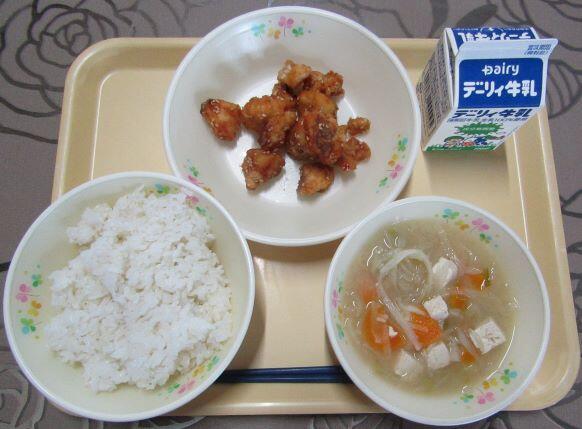 それでは、関連して、この日の給食です。この日は「こばやし地産地消の日」でした。メニューは、麦ご飯、真鯛のピリ辛