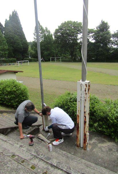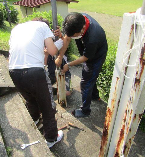 さあ、下のボルトを外して倒します。運動場側に倒すと立てるのが大変なので、校舎側に倒すことにしました。もう一人の