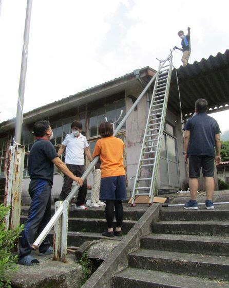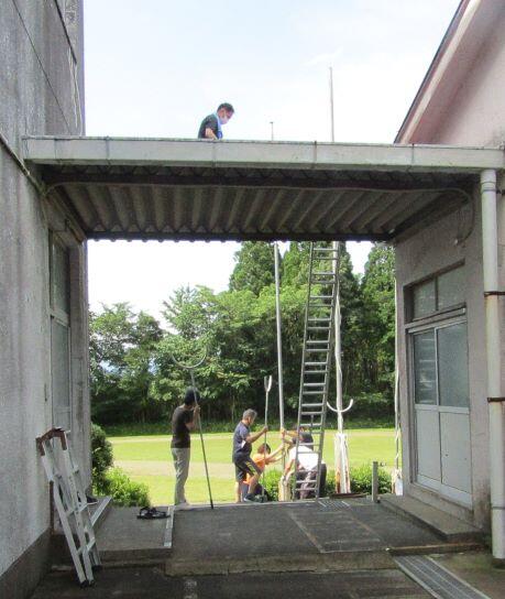 用務員さんが屋根に登ります。手でポールを支える人、さすまたで支える人など、分担しました。準備万端スキなし!
