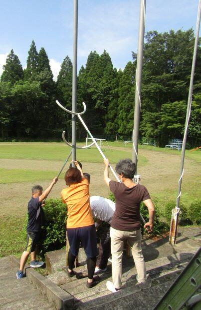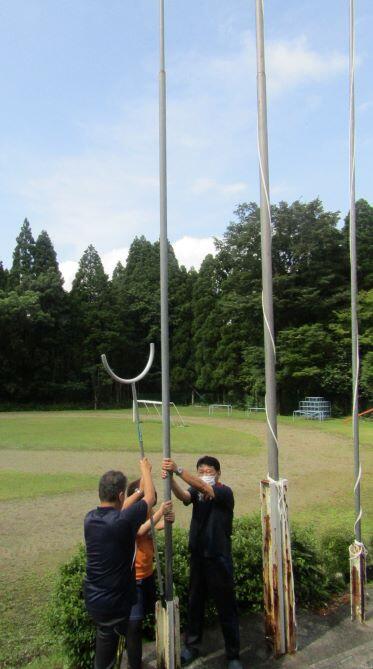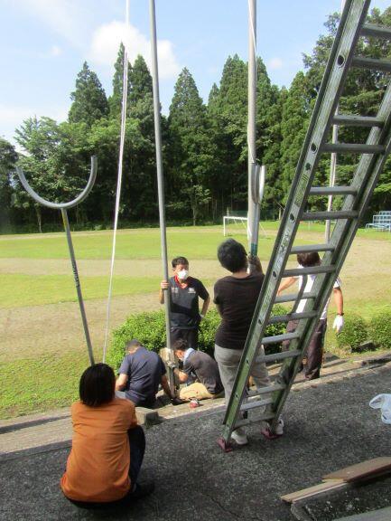 最後は旗です。掲揚台のひもの付け替えについては先日、お知らせしました。残っていた金具を付ける作業が終わり、