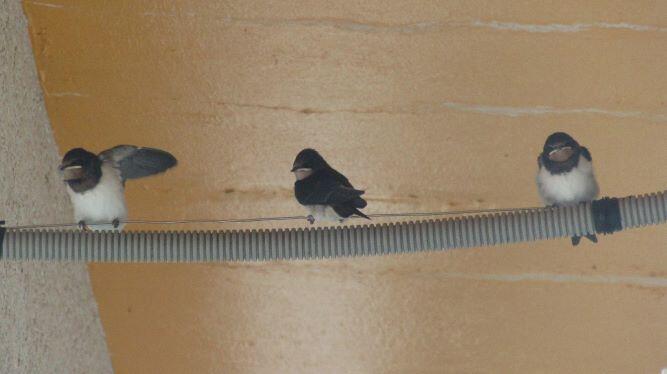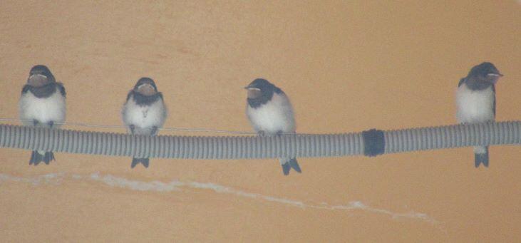 前後いて、写真のようにとまっています。くちばしの根元がまだ白いツバメも見かけます。(上の真ん中の右側と上の右側
