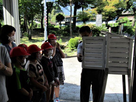 百葉箱の中には何があるのかなぁ~?って作っていただいた先生が扉を開きました。