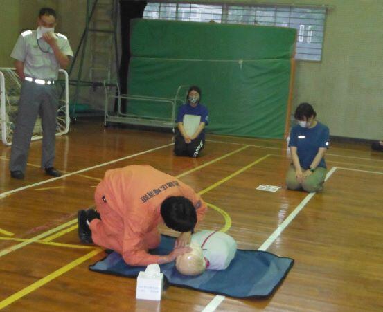 心臓マッサージです。手の組み方はこう? あれっ?こうじゃない? 「そうそう、上手です。」という言葉も聞かれました。