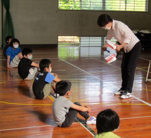6月5日(金) この日、全校朝会がありました。校長先生のお話に続いて、保健室の先生から、『歯』についてお話がありました。そういえば、前の日の4日から10日までは「歯の衛生週間」となっています。先生からは「歯の王様(6才臼歯)」についてと歯ブラシのお話、そして、歯の磨き方について模型を使って指導がありました。虫歯0(ゼロ)を目指しています。しっかり、正しく歯を磨いていつまでも自分の歯で食べることができるようにしましょうね。8020(はちまるにいまる)です!また、小林市では、今年度、西小林中校区の3校(幸ヶ丘小、西小林小、西小林中)がモデル校となって、フッ化物洗口が実施されます。学校への説明は終わりましたので、次は保護者向けに説明会を行い、その後実施となります。来年度は市内の全ての小中学校で開始される予定です。