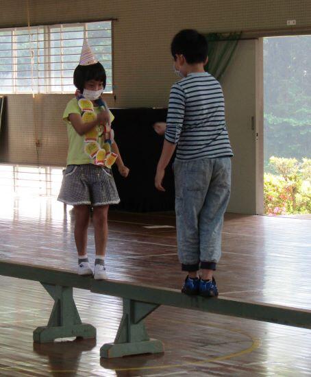 会の始まりです。1年生はとんがり帽子を付けての入場でした。平均台じゃんけん です。バランスをとりながらじゃんけんをします。勝った方はそのまま進み、負けた方は次の子どもが平均台に上がってじゃんけんします。相手の陣地にたどり着いたチームが勝ちます。