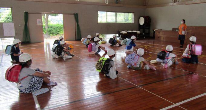 避難訓練、体育館に集まります。この日の訓練は、いろいろな説明、指導を行いました。班長が家に着いたら学校へ報告します。電話連絡の練習も兼ねています。
