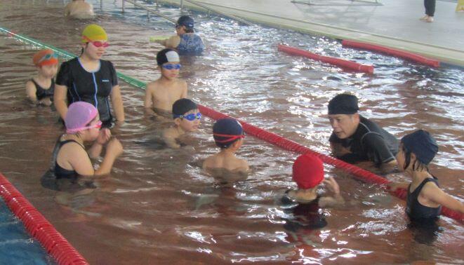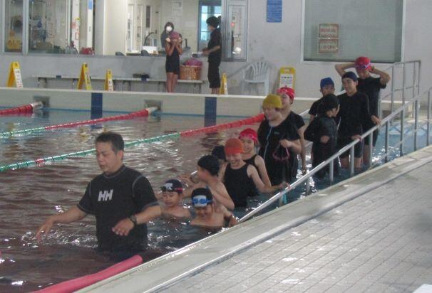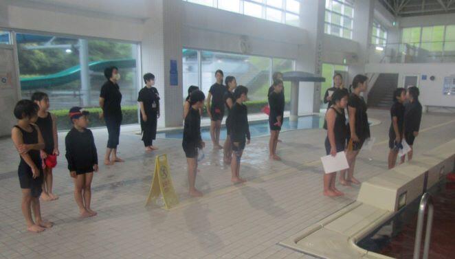 玄関ホールで注意事項を聞いた後、更衣して、いざ!プールへ! プール開きです。入る前に学習の安全を祈りました。室内は気温が高く、カメラのレンズもくもりました(>_<)