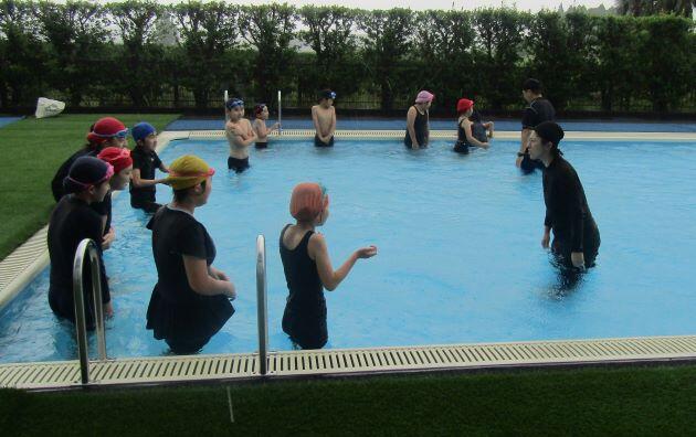 ずんずんずんずん・・・。プールに入ります。つめた~~くない!(^^)/ 授業開始!顔を水につけましょう!