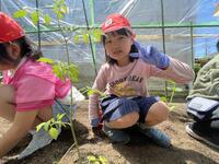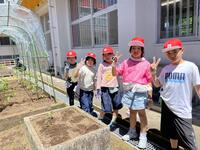 【5月14日】教室横の花壇に野菜(ピーマン、ナス、ミニトマト、きゅうり、枝豆)を植えました。ビニールハウスも作りました。大きく育って、たくさん実がなるようにと思いをこめて一つ一つ丁寧に植えました。植えたばかりですが、早くも収穫が楽しみです。