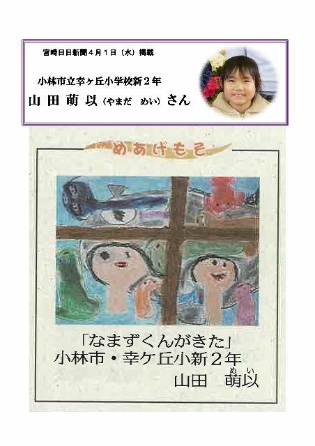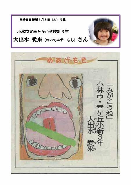 幸ヶ丘小学校では、子どもたちの表現力を高めようと、子どもたちの作文や俳句、絵などを宮崎日日新聞に投稿ています。今年度スタートの4月1日の新聞に幸ヶ丘小の子どもの絵が掲載されました。幸先がいいですね。紹介します。