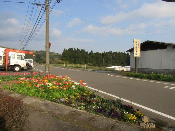 校舎の前庭です。 学校の看板にはすずめもとまりたいようです。看板は左手にある建設会社の方が