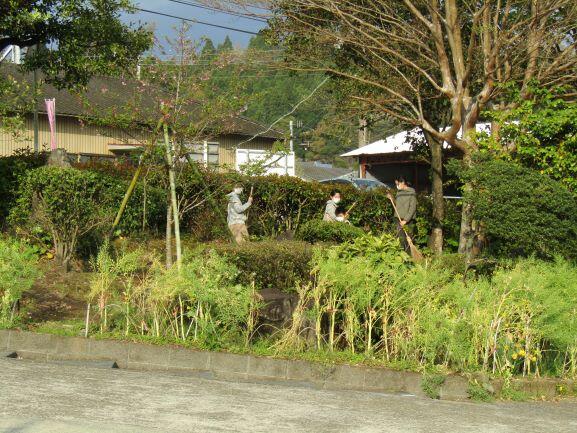 平成29年4月、硫黄山の噴火警戒レベルが2になったので、それ以降登下時にはヘルメットを着用しています。正門のところで一列に並んで、あいさつをして入ります。そして、ボランティア清掃へ・・・。