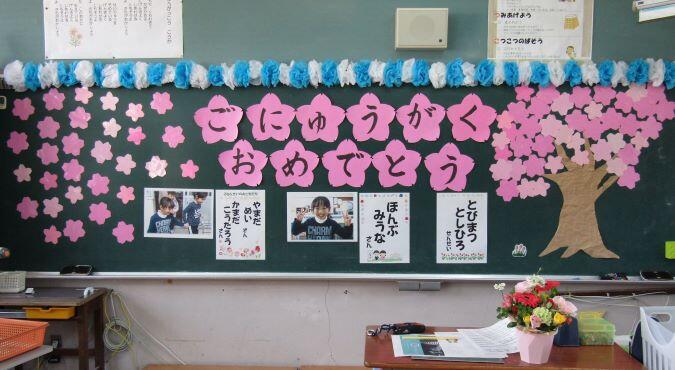 看板です。きれいに飾り付けられていました。教室も新入生を迎える準備が整っていました。