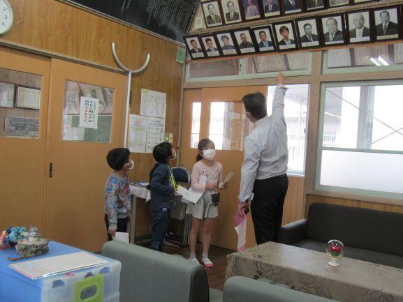 校内巡りです。新入生は歴代のPTA会長さんの写真を見て、「あっ、お父さんだ!」とお父さんの写真を見つけて、