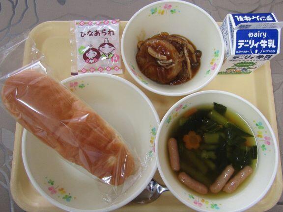 また、飛びますが・・・3日の給食です。「ひな祭り献立」で、メニューは アップルパン、デミグラスソースハンバーグ、カラフル野菜スープ、ひなあられ でした。むかし、ひな人形を連れて外に出る「ひな遊び」という習慣があったそうです。東方学校給食センターのみなさん、とっても美味しかったです。ありがとうございました。(*^_^*)