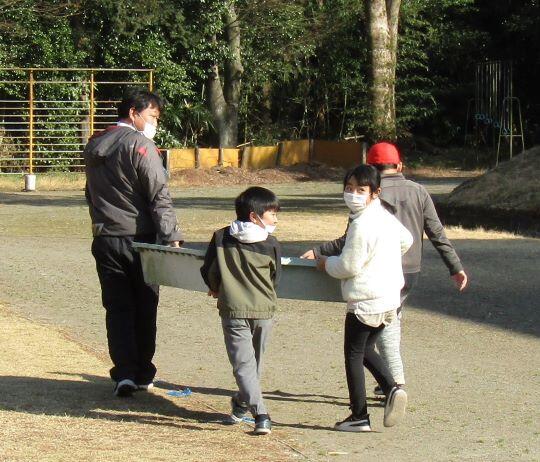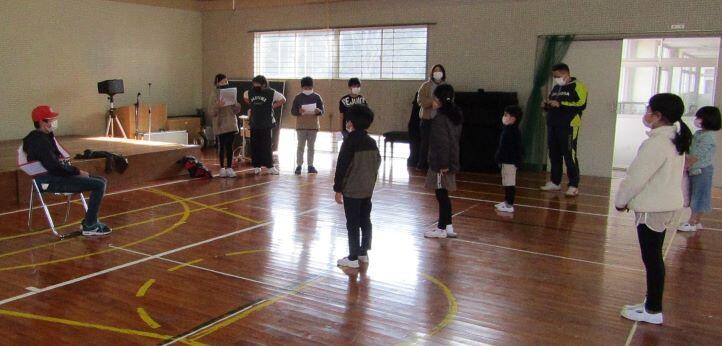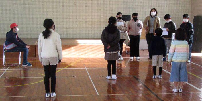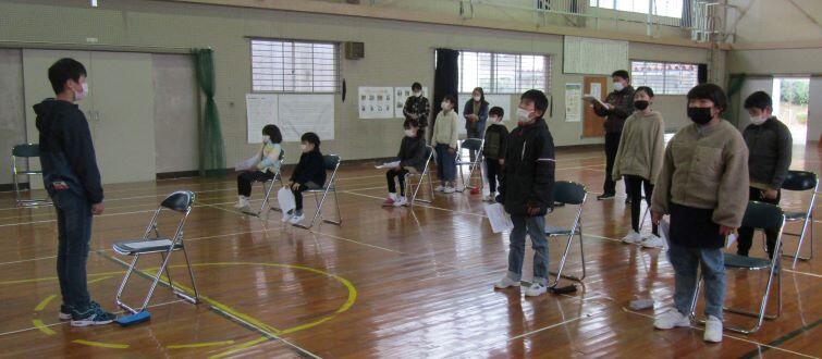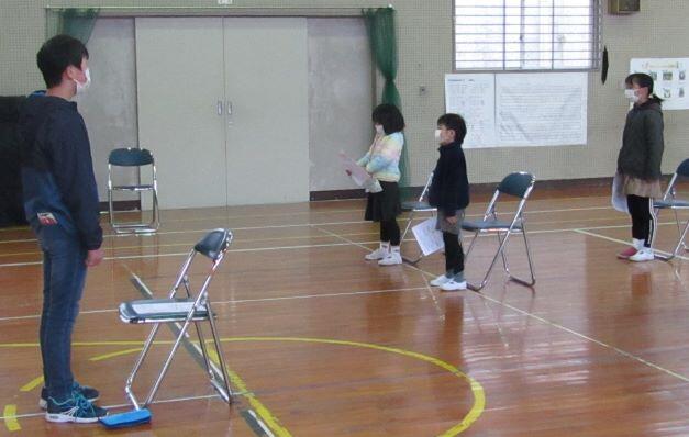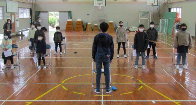 全体を見ながら、大まかに、隊形移動の時の役割などを決めました。具体的には新年度になってからになります。あれっ?一人さみしそうに座っている子どもがいますよ~!6年生でした。新年度にはいないからねぇ・・・。うんうん。