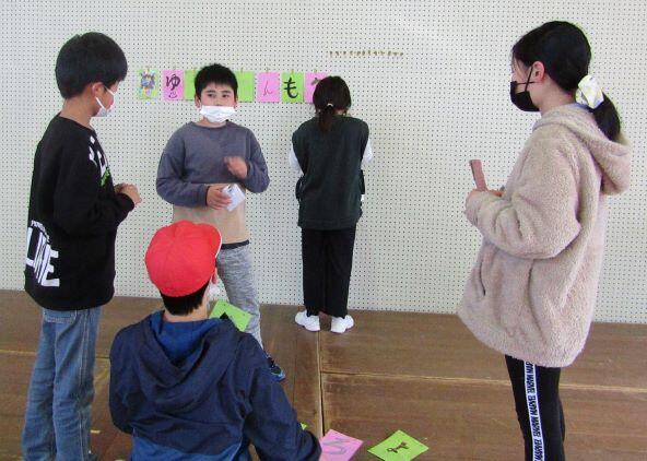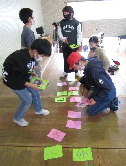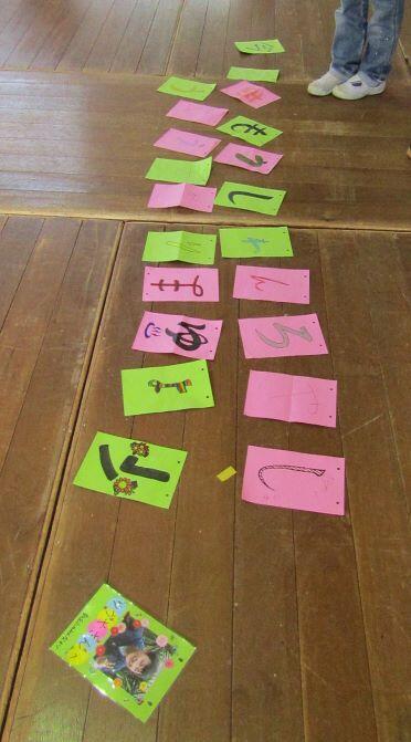 並べ替えて、メッセージをつくります。壁に貼っていきます・・・んが!一文字足りません!(>_<) 全員で探しましたが、見つかりません・・・ミステリー(-_-)