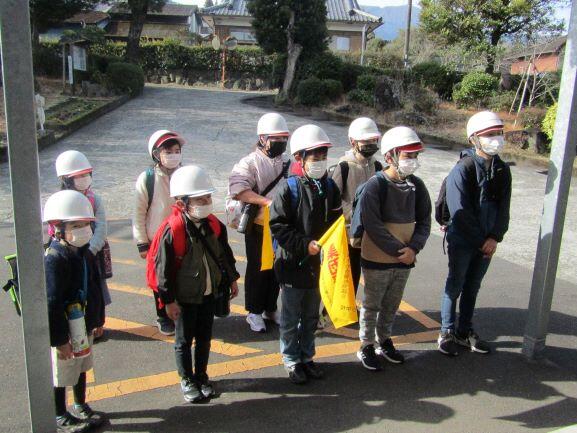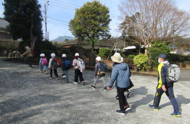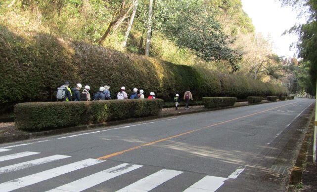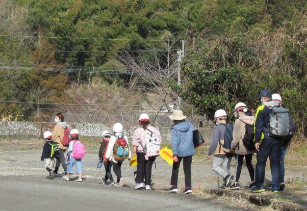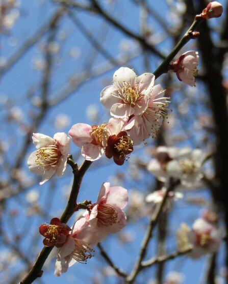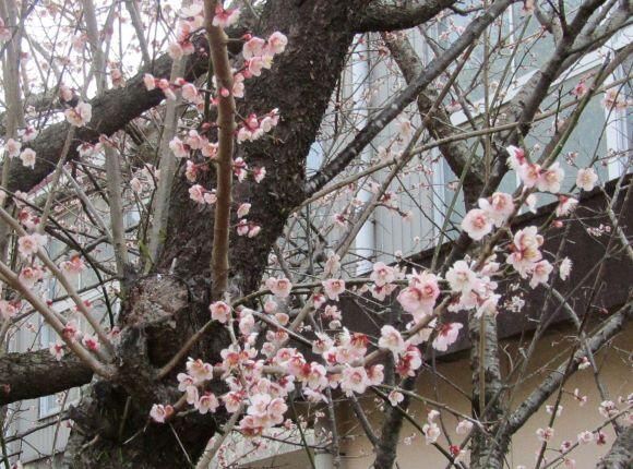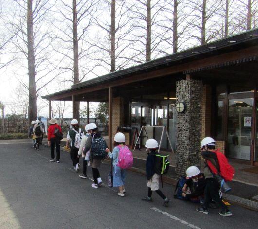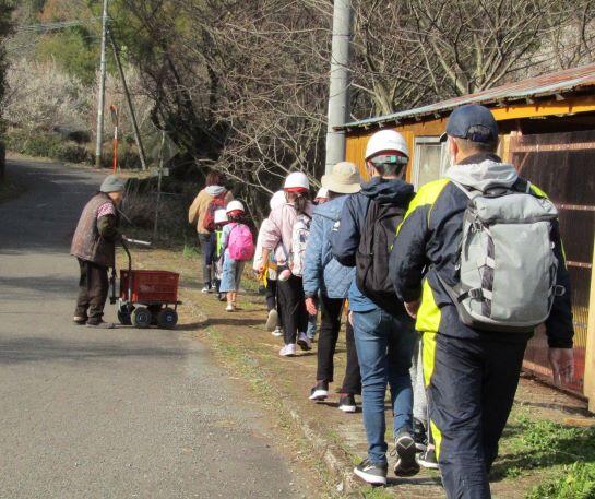 体育館前の梅の木の花も見送ってくれました。(^^) 一列に並んで歩きます!