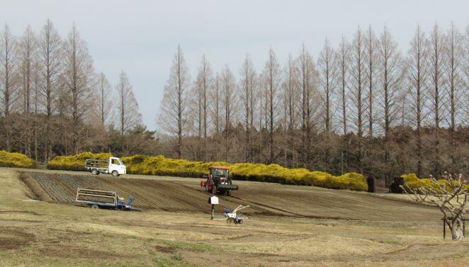 花植の作業をされていらっしゃいました。お疲れ様です。ポピーかな?5月にはきれいなお花畑になることでしょう!その時には、みなさん、お越しくださいね!(^o^) 背景と相まっていい景色ですね!