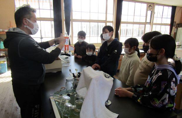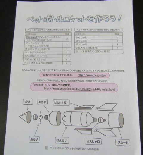 プリントを見ながら、担当の先生が説明します。みんな興味津々の目で、聞いていますよ!(^^) 炭酸飲料用のペットボトルを使いますが、見ただけで、炭酸飲料用と分かります・・・。ここで問題です!ペットボトルのどこを見れば分かるのでしょうか?(^^)