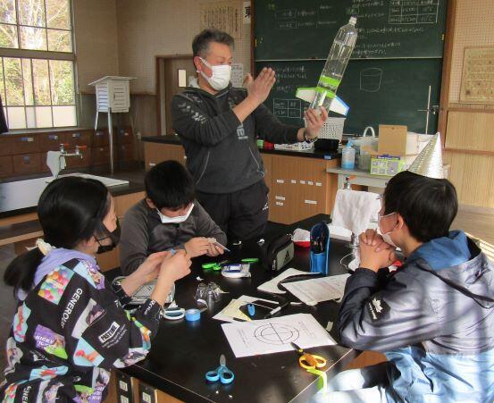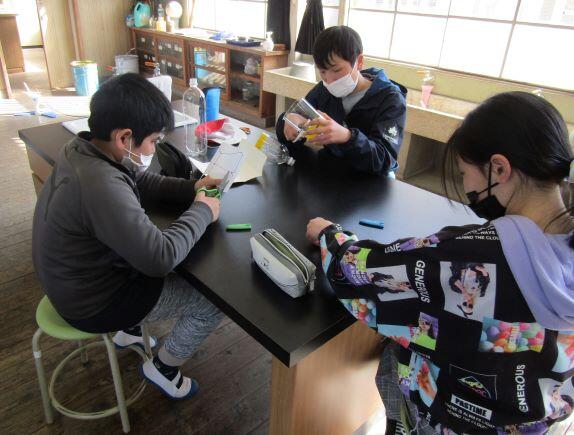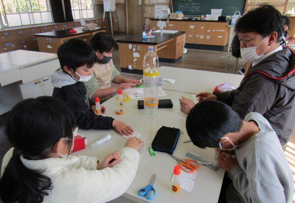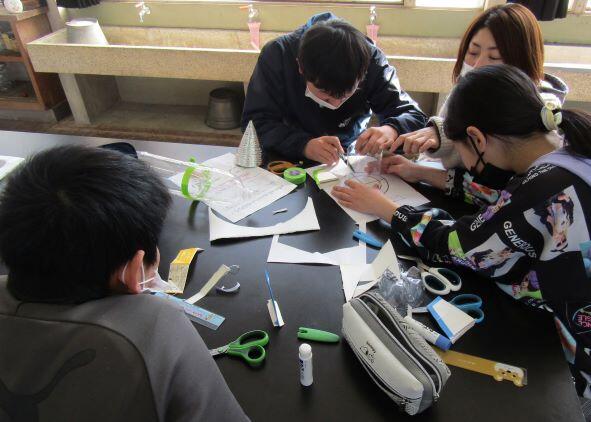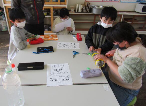 3・4年生と5・6年生に分かれて、作り始めました!ペットボトルを切ったり、羽の紙を切ったりしています。