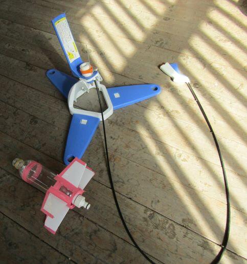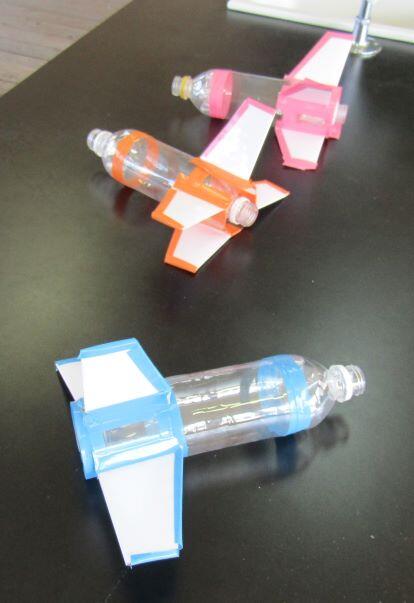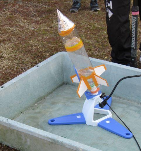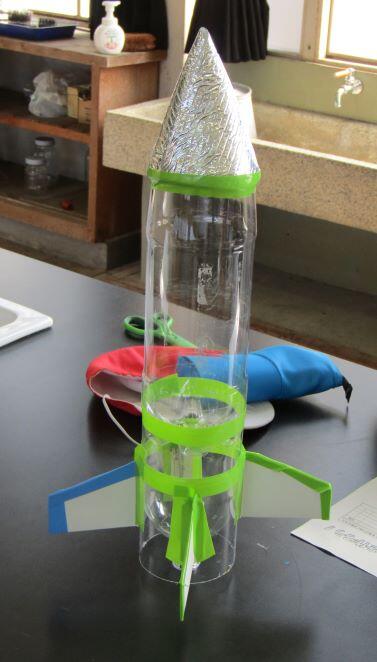 前に作った、ロケットです。参考になるように、置いています。これは500mlですが、今回は 1.5リットルのペットボトルを使います。右側は発射台です!