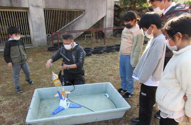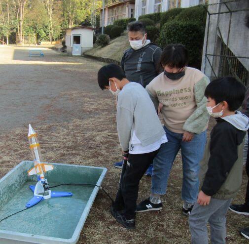 では、運動場で飛ばしましょう!まずは3・4年生から。発射台にロケットを取り付けて、と・・・。