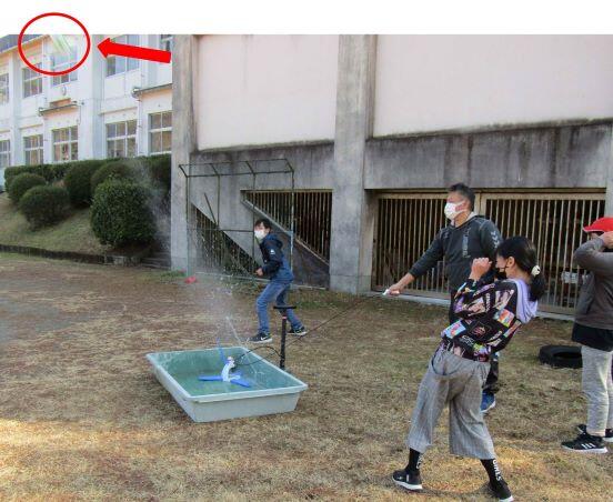 次は5・6年生です。同じように空気を入れてと・・・。発射ーっ! すみません、はしっこにかろうじて写っていました。(^_^;) ちょこっと空気がもれていたようで、あまり飛びませんでした。(>_<)