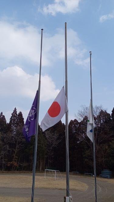 学校では半旗を揚げて、震災の犠牲者、被害者のみなさんへの哀悼の意を示しました。2:46には黙想をしたいと思います。