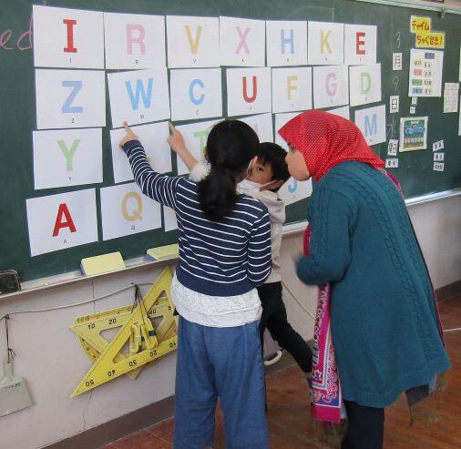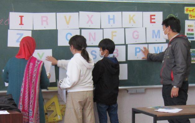 アルファベットの文字を書くことから始まりました。次は黒板に貼ったアルファベットの文字をいくつか抜いて、抜いた文字を当てるゲームをしました。3年生VS4年生、いや、男子VS女子です! 何を隠そうか、相談中です!教頭先生も加わっていますね!(^^) さて、当たるかな?